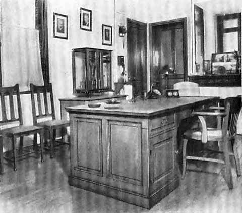 Кабинет директора Института радия в Париже. За этим столом работали Мария Кюри (1918–1934), Андре Дебьерн (1934–1946), Ирен Жолио-Кюри (1946–1956), Фредерик Жолио-Кюри (1956–1958).