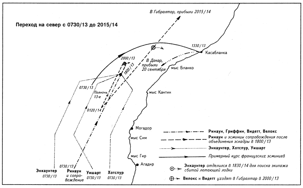 «Если бы англичане пожелали вмешаться, события могли пойти по двум вариантам: а. «Ринаун» и эсминцы блокируют путь. В этом случае нужно вспомнить, что адмирал Бурра-ге приказал крейсеру «Примоге» повернуть назад. Точно так же и он сам мог отойти в Алжир или даже в Тулон вместо Мерс-эль-Кебира. b. «Ринаун» начал бы погоню. Он просто увеличил бы скорость и ушел в Касабланку. Я часто встречал адмирала Бурраге и других офицеров Соединения Y. Разумеется, мы обсуждали различные подробности дела в Дакаре, но мы ни разу не рассматривали перспективы боя в Гибралтарском проливе 11 сентября. Адмирал Бурраге желал любой ценой избежать боя с англичанами. И если адмирал Дарлан позже снял его за недостаточную агрессивность, то потом быстро одумался, произвел Бурраге в вице-адмиралы и назначил на важный пост. Поэтому я думаю, что, рассуждая объективно, можно прийти к выводу: адмирал Бурраге сделал бы все возможное, чтобы избегать боя до того момента, когда англичане откроют по нему огонь».Это заявление получает еще одно подтверждение, если здесь вообще нужны подтверждения. «Милан» не открыл ответный огонь даже после нескольких выстрелов по нему. Капитан Монрайс сбил летающую лодку «Лондон», но сделал это после серии грубейших провокаций. Тщательное расследование, проведенное французами, подтвердило это. Капитан 2 ранга Косте, служивший в штабе адмирала Ребуффеля в Касабланке, подтверждает, что все испытали облегчение, когда выяснилось, что корабли прошли пролив без боя. «Весь день после выхода в море Соединения Y мы страшно нервничали и испытали облегчение, когда обошлось без боя».
