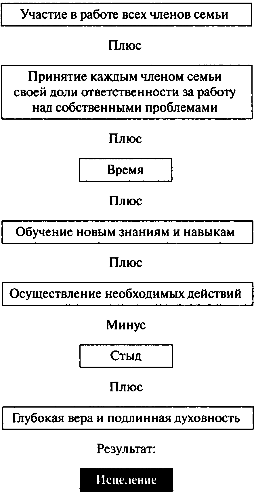 Можно представить процесс семейного исцеления в виде своеобразного «математического выражения», состоящего из семи членов, которые отражают шаги по пути выздоровления (таблица 1.1). Кратко остановимся на характеристике каждого шага.Участие в работе всех членов семьи