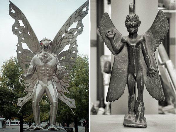 Пацуцу (Пазузу) — разъяренный демон расы рептилоидов. Изображают иногда с телом скорпиона, головой дракона, льва или змея, крыльями саранчи, имеет рога на голове, гребень, хвост, лапы орла, часто изображают змею вокруг ноги. Правая рука-лапа поднята, левая в стороне. Нет, это не «римское приветствие». Пишут, что жест символизировал жизнь и смерть, созидание и разрушение. Хотя кто знает на самом деле, что означает этот «римский» жест. «Идущие на смерть приветствуют тебя, цезарь». М-да.