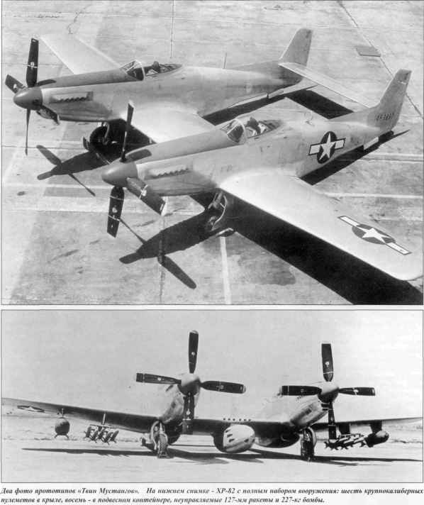 Последним в ряду «Мустангов» стал P-82 «Твин Мустанг». Первоначально P-82 был заказан как истребитель сопровождения, способный эскортировать бомбардировщики от баз на Сайпане до Японских островов и обратно. Но захват Иводзимы решил эту проблему, и темпы разработки ХP-82 резко снизились. ХP-82 представлял собой пару фюзеляжей ХP-51F, объединённых центральной секцией крыла, в которой разместили всё вооружение, и стабилизатором. Фюзеляж удлинили на 1,45 м с помощью вставки, располагавшейся сразу за радиатором. Кроме того, увеличили размеры вертикального оперения. Внешние консоли крыла и рули направления позаимствовали у P-51Н. Силовая установка состояла из двух моторов «Паккард V-1650-1121», на чрезвычайном режиме с впрыском воды, развивавших мощность 2270 л.с. на высоте 12000 м. Винты вращались в противоположные стороны, чтобы компенсировать огромный крутящий момент. Так как ХP-82 был задуман в качестве дальнего истребителя сопровождения, в обеих кабинах имелись органы управления, но полный комплект приборов был установлен только в левой кабине.