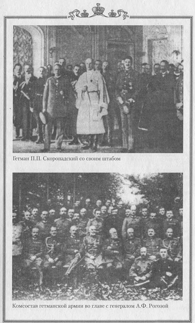 Одной из форм самоорганизации офицерства была служба в гетманской армии. Гетманская власть, в отличие от петлюровской, не была на деле ни националистической (лишь по необходимости употребляя «самостийные» атрибуты и фразеологию), ни антироссийской. Это давало возможность даже возлагать некоторые надежды на нее и ее армию как на зародыш сил, способных со временем освободить от большевиков и восстановить всю остальную Россию. Гетманская армия состояла из кадров 8 корпусов, 20 пехотных и 4 кавалерийских дивизий, 6 кавалерийских бригад, 16 легких и 8 тяжелых артбригад. Эти кадровые части состояли исключительно из подразделений старой российской армии (11-й, 12-й, 15-й, 31-й, 33-й, 42-й пехотных, 3-й и 4-й стрелковых, 7-й, 8-й, 9-й, 10-й, 11-й, 12-й кавалерийских, подразделений 4-й, 13-й, 14-й, 19-й, 20-й, 32-й, 34-й, 44-й пехотных, 3-й и 16-й кавалерийских дивизий). Все должности в гетманской армии занимали русские офицеры, в абсолютном большинстве даже не украинцы по национальности.