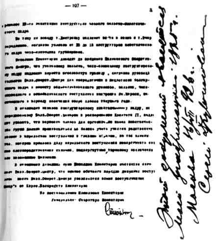 «...Подготовку к возвращению в Варшаву заканчиваю. Михаил прибыл благополучно, обосновался согласно легенде... Воробьев работает хорошо, поляки ему верят и дают серьезные поручения. Известные вам Матушевский и Братковский отбыли в Варшаву. В отношении Дружиловского неясно, не вернулся ли он в Ревель? О моем отъезде в Варшаву сообщит Михаил...Кейт».