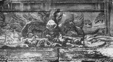 На центральном столбе второго этажа изображена довольно интересная для любителей символики сцена. Хотя изображение сильно пострадало от непогоды — частично разрушилось, потрескалось, выветрилось, — разобрать сюжет ещё можно. Мы видим, как человек сжимает ногами грифона, чьи лапы без когтей и львиный хвост сразу бросаются в глаза — эти признаки сами по себе обеспечивают точную идентификацию. Левой рукой человек хватает чудовище за голову, а правой замахивается на него [XII].