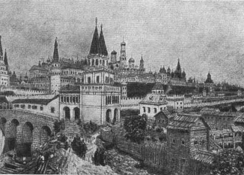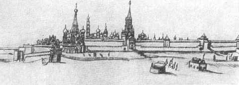 Вид Московского Кремля с Красной площади. Рисунок из альбома Л. Мейерберга. 1661–1062 гг.