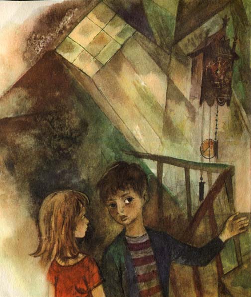 — Он выпьет твой чай и будет звонить в стакан. — А ты б хотела, — спрашивал в свою очередь Пётрусь, — чтоб в окно прыгнул Репейный Растрёпыш? — Хотела бы. А что он будет делать? — А он прищепит пять репьёв к твоим волосам. — А ты б хотел, чтоб твой кусок пирога рос, рос и вырос бы в дом. — Хотел бы. А что будет в этом доме? — А в доме будет жить Изюминка — Сладкий Глаз. — А что будет делать Изюминка — Сладкий Глаз? — А вот если ты съешь окошко из этого дома, так она сразу вставит новое. — А ты б хотела… Но докончить Пётрусь не успел, потому что вошла тётя. — А я бы хотела, — сказала тётя, — чтоб вы в конце концов съели свой пирог, убрали со стола и пошли играть. В саду Пётрусь решил продолжить игру: — А ты б хотела, чтоб мы увидели тигра? — Хотела бы. А что он будет делать? Но не успел Пётрусь придумать, что будет делать тигр, как он явился перед ними. Маленький тигр. Рыжий и полосатый. В красных лучах заходящего солнца шерсть у него золотилась и блестела. Он брёл к крыльцу по тропинке, обсаженной ноготками и анютиными глазками. — Тигрёнок! — позвал Пётрусь. И Кася повторила следом за ним: — Тигрёнок, стой! Тигрёнок обернулся. Глаза у него были золотые и сверкающие. И от этих глаз засветились между деревьями жёлтые полосы, похожие на вечерние окна. Тигрёнок смотрел некоторое время на ребят, потом, видно, забыл, что его позвали, повернулся и двинулся дальше. Но в том месте, где он останавливался, на тропинке лежало что-то блестящее. — Ключик! — Неужели он потерял ключик? — удивилась Кася. Но Пётрусь нисколько не удивился. — Ну конечно. Он знает, что мы всё равно от него не отстанем и что золотой ключик нам пригодится. Ребята взбежали на крыльцо, поднялись следом за тигрёнком по лестнице, выше и выше. Тигрёнок толкнул лапой приоткрытую дверь. Ребята скользнули за ним. Это был чердак. У стены стояла черногривая лошадка-качалка, вся пыльная, даже опущенные книзу глаза и те запылились, — наверно, лошадка потеряла уже надежду на счастье. Старые часы показывали давным давно миновавшую полночь. Какие-то зонтики, абажуры и перья висели в углу, покрытые паутиной и пылью. Тигрёнок вскочил на кресло с отбитой ручкой. Уцелевшая ручка была резная и изображала льва. На чердаке было темновато, и глаза у тигрёнка вспыхнули огнём, как минуту назад в саду. Кася прошептала: — Видишь, это его царство. Тут лошадь и лев. Что он тут делает, когда остаётся один? — Часы тогда начинают тикать, бьют через каждый час и, может быть, из них выскакивает тогда кукушка. — Да, да. А из зеркала, может быть, выходит волшебник, садится в кресло и начинает рассказывать удивительные и страшные истории. Они спустились вниз, и тигрёнок шёл вместе с ними. Тётя дала ему молока в блюдечке под лавкой и сказала, что его зовут Тимонек. Кот Тимонек. В самом деле, произошло нечто странное: стоило тигрёнку переступить порог кухни, как он уменьшился в размерах, и глаза у него стали другие, и шерсть больше не сверкала. Он точно погас. Пётрусь сказал Касе: — Это тебе не какой-нибудь обыкновенный кот Тимонек. Тётя ещё не знает. Только что он был совсем другой. Как он на нас смотрел! Если знать настоящие слова — какое-нибудь заклинание, то ещё неизвестно, что случится. Увидишь!