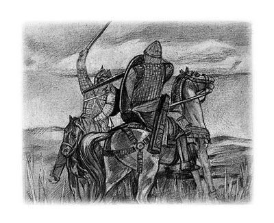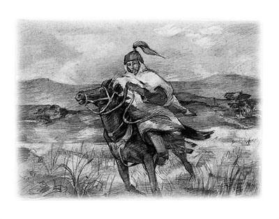 А вот он уже мчится по заросшей тропе, огибая неровности рельефа… мчится по степи, подгоняя коня камчой…15