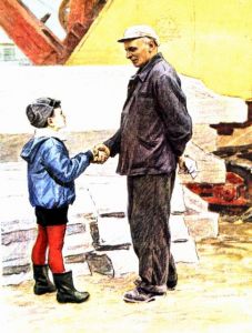 — А за что? — спросил он шёпотом. — Не знаю, — пожал плечами Василий Иваныч. — За работу, наверное. Копал, копал и выкопал, — пошутил он. Витька глядел снизу вверх — маленький человек, у которого всё впереди, — и видел, как хорошо, ласково улыбается ему Василий Иванович Кукин, ленинградский рабочий, машинист экскаватора — хозяин зубастой машины. Герой не выдуманный, а настоящий.