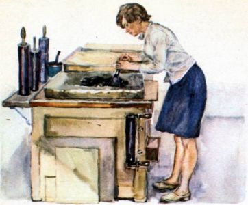 В наборном цехе рабочие трудились, стоя возле высоких столов со скошенными крышками. Неподалёку от входа работал молодой наборщик в синем халате. Мария подошла поближе. Руки наборщика прямо летали над столом, выхватывали из маленьких ящичков буквы-литеры. Быстро-быстро.