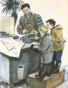 Слышится мерное постукивание, шелест, гудение… Звуки всё отчётливее: мы приближаемся к станкам. Мальчики рвутся вперёд, но я придерживаю их за руки. — Осмотритесь, — говорю. — Вы же в первый раз на заводе. А то бегом, бегом — ничего и не запомните. Остановились. Объясняю ребятам, какие перед нами станки. Вот этот, длинный и низкий, — токарный; этот — у него будто воротца над корпусом — строгальный. Тот — в виде башенки — фрезерный. А подальше — сверловочный… — А они красивые… — говорит Алёша, склонив голову набок и прищуриваясь на корпуса станков. — Немножко зеленоватые, немножко голубоватые, немножко желтоватые… Подсказываю: — Это салатный цвет. И объясняю, что красить так станки посоветовали учёные. Рабочим понравилось. В самом деле: цвет ласковый, приятно смотреть, не утомляются глаза. А глаза не устают — и работа спорится. У станков рабочие. Каждый делает своё дело. Алёша потянул меня за руку. Шепчет: — Который из них Русаков? Я вглядываюсь в лица рабочих. Стараюсь узнать Николая Николаевича. Вспоминаю, как во время войны я услышал о подвиге радиста. А потом и самого увидел. Было это на каком-то — уже не помню — совещании, где лучшие люди армии делились боевым опытом… Узнай-ка человека после короткой и единственной встречи! Да ещё через четверть века… Я за это время состарился, но ведь и он не остался молодым. — Ну, который же? — настаивает Алёша. — Покажи! А я могу только плечами пожать. — Тогда я сам! — срывается он с места. — Который высокий и у которого волосы как у меня… Можно? — Только не беги, спокойнее. — И я! — попросился Саша. Алёша подошёл к станкам с левого края, Саша — с правого. Стою. Жду, что принесёт ребячья разведка. Первым обратно примчался Саша. Вприпрыжку! — А там, — кричит, — кнопки! На станках кнопки! Нажмут и — джик! — режет железо. Нажмут — и стоп станок! Кнопки, кнопки, кнопки, кнопки! Едва успокоил его. — Ну, отдышался? — говорю. — Теперь слушай. Всякая вещь хороша на своём месте. В далёкую старину, ты знаешь, заводами в России владели капиталисты. Это было, вставил Саша, — до Октябрьской революции. — Совершенно верно. Станки в ту пору были грубые, неуклюжие и опасные для работы. Чтобы привести такой станок в действие, рабочий наваливался на рычаг. А рычаг — как лом или как оглобля. Навалится, толкает что есть силы… Ух!.. наконец-то загремел, забрякал станок. Надрывались рабочие у станков, делались калеками. А капиталист их и за людей не считал. «Изувечился? Сам виноват, иди прочь с завода!» И ставил к станку другого. Капиталисту и станка было не жалко: «Пусть себе гремит, пока не развалится. Так-то выгоднее, чем покупать новый!» Я беру Сашу за плечи и поворачиваю к станкам. — А погляди, — говорю, — на наши. Удобные, красивые. И у рабочего под руками, конечно, кнопки. Но эти кнопки не заменяют человека, а помогают ему в труде. Так мы беседовали с Сашей, пока не прибежал из разведки Алёша. Радостный и взволнованный, он объявил: — Узнал про Русакова! Он не здесь, а вон там работает, где домашние растения.