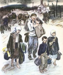 — Мама! Как война по пятам ходит? — спрашивает Таня. Нина Игнатьевна опустила руки с шитьём на колени и не сразу находит, что ответить. — Откуда ты знаешь? Кто тебе это сказал? — спрашивает она, желая оттянуть время. А сама думает: «Вот и подросла моя Таня, всю правду хочет знать». — Мне бабушка сказала, что нашего папу в мирное время война догнала, что она за ним всё время по пятам ходила… Трудно Нине Игнатьевне рассказывать о своём муже. Пришёл он домой с работы, лёг на диван отдохнуть и больше не встал. Остановилось у него сердце. Навсегда остановилось. Видно, в самом деле война за ним по пятам ходила. И рассказала Нина Игнатьевна про всю жизнь Таниного папы. …Таниному папе было всего пять лет, когда началась война. Кроме него в семье было ещё четверо детей. Старшему пришло время паспорт получать, а самого маленького ещё грудью кормили. Надел Танин дедушка, которого она знает только по рассказам, солдатскую шинель, обнял свою жену, поцеловал старших детей, каждого по очереди, маленького на руках подержал, а самому старшему положил руки на плечи и сказал: — Помни, сын, что ты теперь остаёшься вместо меня. Маминой опорой будешь, младших в обиду не давай и защищай от беды, пока я не вернусь. Сказал так и ушёл. И больше не вернулся. Погиб от вражеской пули. Жила семья солдата недалеко от границы в небольшом городе. С каждым днём фронт подходил всё ближе и ближе. Красным пламенем полыхало по ночам небо на западе. Летали над городом вражеские самолёты. Однажды прилетели фашисты и сбросили свой смертоносный груз. В это время вся семья Таниного папы ужинать собиралась. На тарелках горячая картошка дымилась, возле каждой тарелки лежал тоненький ломтик хлеба. А самого маленького солдатская вдова грудью кормила. Вдруг раздался взрыв и обрушилась стена дома, и погибли под стеной в собственном доме женщина и ребёнок. Заплакали девочки, сёстры Таниного папы, а Танин папа хоть и маленький был, но не заплакал. Побледнел, губу закусил. Встал старший сын, вспомнил, что ему отец-солдат завещал, схватил детей за руки, вытащил на улицу, в огороде между грядок укрыл. А в это время фашисты совсем низко летали, из пулемётов расстреливали тех, кто не успел спрятаться и от страха по улицам бегал. Так остались дети одни, без отца и матери. А фашисты уже к городу подходили. — Надо двигаться на восток, — решил старший солдатский сын. — Эх, ушёл бы я на фронт, если бы не отцовское завещание. Собрали солдатские дети в узелки всё, что могли унести, и пошли по дороге на восток. Идут-идут, устанут. Сядут у дороги, посидят, хлебца пожуют. А когда хлеб кончился, кормились тем, что давали им такие же беженцы, как они.
