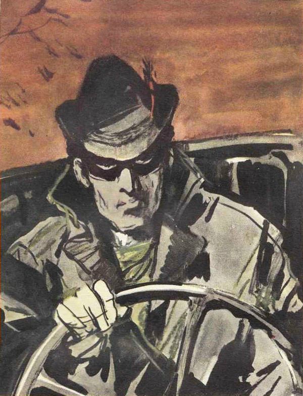 (Перевод А. Горского)Место — пустынный, окаймленный зарослями вереска участок шоссе Истборн-Танбридж близ Кросс-Инхенда. Время — половина двенадцатого ночи в одно из воскресений на исходе лета. По дороге медленно двигался автомобиль — поджарый, длинный «роллс-ройс» с мягким ходом и тихо урчащим мотором. В ярком свете передних фар по сторонам проплывали, как на киноэкране, колеблемые ветром верхушки трав и кустарника и тут же отступали во мрак, казавшийся по контрасту еще более густым. Позади на полотне дороги отсвечивало рубиновое пятно от стоп-фары, однако ее тусклый красноватый свет не позволял разглядеть номерной знак. Это была открытая машина туристского типа, но даже в темноте безлунной ночи наблюдатель не мог бы не заметить какой-то бесформенности ее очертаний. Все стало ясно, когда автомобиль пересек широкий поток света, падавший из открытой двери придорожного коттеджа. Кузов машины был накрыт чехлом из сурового полотна. Даже длинный черный капот был тщательно задрапирован каким-то материалом. Странным автомобилем управлял широкоплечий, плотный водитель; он был один в машине. Низко надвинув на глаза тирольскую шляпу, он сидел, сгорбившись над рулевым колесом. В тени, отбрасываемой шляпой, сверкал багровый кончик горящей сигареты. Воротник свободного, широкого пальто из материала, похожего на бобрик, был поднят. Человек сидел, подавшись вперед и вытянув шею, и пока автомобиль с переключенным на холостой ход мотором бесшумно скользил вниз по отлогой дороге, водитель, словно в каком-то нетерпеливом ожидании, пристально всматривался в темноту. Издалека, с южной стороны, донесся приглушенный расстоянием автомобильный сигнал. В воскресную ночь в таком месте движение по дороге происходило преимущественно с юга на север — поток лондонцев, отдыхавших на побережье, возвращался в столицу. Человек в машине выпрямился и прислушался. Сигнал повторился в той же стороне. Человек снова нагнулся над рулем, все так же напряженно всматриваясь в темноту, потом внезапно выплюнул окурок и глубоко вздохнул. Далеко впереди, огибая поворот шоссе, показались две маленькие желтые точки. Вот они скрылись в выемке, потом снова вынырнули и снова исчезли. Водитель замаскированного автомобиля перешел от пассивного ожидания к действиям. Он достал из кармана черную маску, надел ее и приладил на лице, так, чтобы она не мешала видеть. На мгновение он включил ручной ацетиленовый фонарик, быстро оглядел себя и положил фонарь на сиденье рядом с маузером Потом он еще ниже надвинул шляпу, выжал сцепление и включил коробку скоростей. Вздрогнув и заурчав, черная машина словно подпрыгнула и, мягко дыша мощным мотором, помчалась по отлогому спуску. Шофер выключил передние фары и припал к рулю. Только мутно-серая полоса в темном вереске показывала линию дороги. Спереди донеслось лязганье и фырканье встречной машины, взбиравшейся на подъем. Напрягая старческие силы, она кашляла и хрипела, а ее мотор стучал, как больное сердце. Ярко-желтые лучи света еще раз скрылись из глаз — машина снова нырнула во впадину, а когда она выбралась на пригорок, между двумя автомобилями оставалось ярдов тридцать. Черная машина резко встала поперек дороги, преграждая путь, и человек в маске предупреждающе помахал ацетиленовым фонариком. Старенький автомобиль отчаянно взвизгну