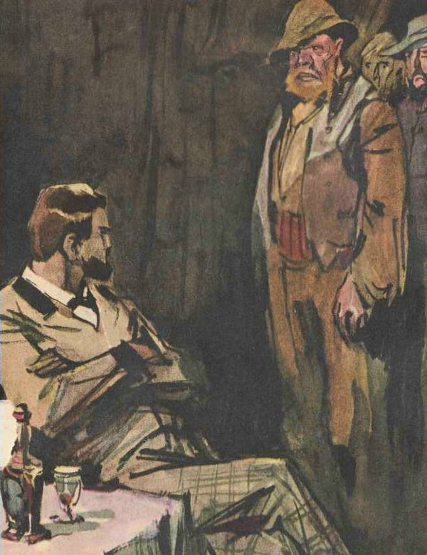 Глава фирмы только-только успел вернуть себе душевное спокойствие, после того как он выполнил свой тяжкий долг и объяснил вдове Хадсон ее финансовое положение, когда его чуткий слух уловил звук тяжелых шагов в конторе. И тут же послышался грубый голос, который в выражениях, куда более энергичных, чем те, что обычно раздавались в этих респектабельных стенах, осведомился, можно ли видеть хозяина или нет. Ответ, по-видимому, последовал утвердительный, потому что грузные шаги начали быстро приближаться, а затем два мощных удара в дверь возвестили, что посетитель находится по ту ее сторону. — Войдите! — крикнул мистер Гердлстон, кладя перо. Вследза этим приглашением ручка опустилась, и дверь медленно повернулась на петлях. Однако в комнату проник только сильный аромат спиртных напитков, за которым не последовало ничего более существенного. — Входите же, — нетерпеливо повторил коммерсант. При этом втором разрешении из-за косяка медленно возникла густая копна черных волос. Затем лоб цвета меди и пара косматых бровей, а вслед за ними — два глаза, желтоватых и нездоровых, которые словно стремились выскочить из глазниц. Глаза эти неторопливо оглядели сперва главу фирмы, а затем и весь кабинет, после чего, словно успокоенная осмотром, появилась и остальная часть лица: расплющенный нос, большой рот, нижняя губа которого отвисала, обнажая ряд пожелтевших от никотина зубов, и наконец всклокоченная черная борода, начинавшаяся от самых скул и неопровержимо свидетельствовавшая, что ее владелец ел за завтраком яичницу. За головой не замедлило последовать и туловище, но, впрочем, все тем же манером, свойственным больше анаконде, и наконец на пороге возник весь человек целиком. Это был коренастый моряк в неизменной куртке и синих штанах. Свою клеенчатую шляпу он держал в руке. Скрипя подошвами и неприятно ухмыляясь, он двинулся к коммерсанту, протягивая в знак приветствия волосатую руку, испещренную татуировкой. — Здравствуйте, капитан, — сказал Гердлстон, подымаясь и сердечно тряся руку вошедшего. — Рад вас видеть целым и невредимым. — И я рад вас видеть, сэр, очень рад. Голос у посетителя был низкий и хриплый, а походка — неуверенная, словно после тяжелого запоя. — Я вошел эдак осторожно, — продолжал он. — Я ж не знал, кто тут может у вас сидеть. Когда мы, значит, с вами беседуем, нам лишние уши не нужны. Гердлстон чуть-чуть приподнял косматые брови, как будто этот намек на общие его секреты с капитаном пришелся ему не слишком по вкусу. — Может быть, вы все-таки присядете? — сказал он. Капитан взял плетеный стул и отнес его в самый дальний угол кабинета. Затем он внимательно осмотрел стену, постучал по ней костяшками пальцев и наконец сел, продолжая время от времени с опаской поглядывать через плечо. — Чего-то на меня трясучка находит, — объяснил он владельцу фирмы. — Ну, и оно спокойнее, когда знаешь, что позади-то никого нет. — Вам следовало бы побороть это отвратительное пристрастие к горячительным напиткам, — нравоучительно заметил мистер Гердлстон. — Так проматываются драгоценнейшие дары, которыми награждает нас провидение. Это не доведет вас до добра ни в этом мире, ни в том. Однако этот разумнейший совет, казалось, не произвел на капитана Гамильтона Миггса ни малейшего впечатления. Более того, он испустил довольно громкий смешок и, хлопнув се
