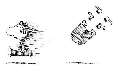 Тукка выскочил из-под стола. Увы, он зацепился штанами за гвоздь и выскочил заодно и из штанов. Понятное дело, он тут же спрятался обратно.