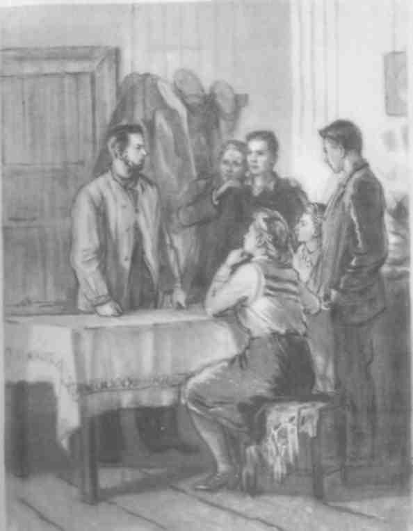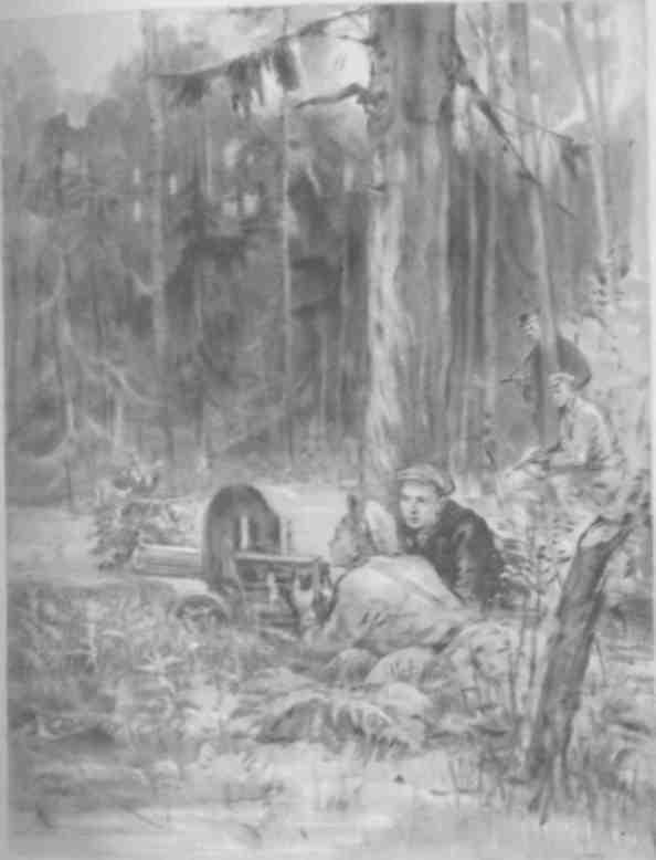 Заслонов собирал силы. Весь март ушел на пополнение и укрепление отряда. Походив по деревням, заслоновцы увидали, какой любовью к Родине и ненавистью к фашистским захватчикам горит советский народ. Грабежи и насилия, виселицы и тюрьмы, угон молодежи в рабство в Германию — всё это звало к борьбе, к сопротивлению наглому врагу. Народ поднимался. Сопротивление росло и крепло от день от дня. Из-под Витебска, Лепеля, Рудни — отовсюду шла молва о партизанских отрядах. По рассказам местных колхозников, в лесах ближайших районов уже действовали отдельные, не связанные между собою, группы народных мстителей. Там партизанами командовал какой-то «лейтенант с усиками», в другом месте — колхозник Денис, в третьем — районный киномеханик. Секретарь райкома Ларионов предложил Заслонову объединить все эти партизанские группы под своей командой. Отряд Заслонова рос. Слух об отряде дяди Кости уже катился по Оршанскому, Сенненскому, Богушевскому районам. Стояли теплые весенние дни. В канавах, не смолкая ни на минуту, шумела вода. Над оттаявшими, влажно-черными полями звенела ликующая песня жаворонка. Снег небольшими пятнами белел кое-где в кустах и лощинах. Проселочную дорогу окончательно развезло — ни пройти, ни проехать. Женя Коренев и Леня Вольский шли в деревню Залужье к своему связному Остапу Крупене, бывшему колхозному бригадиру, за новыми данными о фашистских гарнизонах в Сенно, Смольянах и Богушевске. Вся семья Крупени — жена, семнадцатилетняя дочь Галя и двенадцатилетний Юрка — помогала партизанам. Немцы в Залужье не стояли. Но всё портил староста: он недолюбливал Остапа, чувствуя в нем врага. Женя и Леня только к ночи едва дотащились по грязи до Залужья. Хата Крупени стояла на краю деревни. Партизан здесь уже ждали: глиняный черепок, висевший на заборе, — условный знак — показывал, что в хату можно входить смело. Узнав у Крупени все новости, партизаны хотели было пускаться в обратный путь, но хозяева уговорили их остаться переночевать. — Переночуйте, отдохните — куда там итти! — убеждала хозяйка. — Ночью по такой дороге какая ходьба! Только ботинки совсем разобьете да измучитесь понапрасну, — резонно говорил Остап. Отправляя их на разведку, дядя Костя не ставил им условия обязательно к утру вернуться назад, — слишком тяжела была дорога по непролазной грязи. И друзья заночевали. Так приятно было лечь спать, хотя и не раздеваясь, но лечь на сено, а не на колючие еловые ветки! Так приятно чувствовать под головою не слежалый, пахнущий плесенью, жесткий ком старой соломы, а настоящую мягкую подушку! Проснулись разведчики с солнцем. Их разбудил горластый хозяйский петух, каким-то чудом уцелевший от прожорливых фрицев. Женя и Леня встали бодрые, полные сил и пошли умываться. Хозяйка усадила их за стол подкрепиться на дорогу. Друзья кончали завтракать, когда в хату вбежал перепуганный Юрка, которого отец послал узнать, что слыхать на другом конце деревни. — Староста идет с двумя солдатами! Уже около Сымонихи! — залепетал испуганный Юрка. Женя и Леня выскочили из-за стола, невольно хватаясь за пистолеты и гранаты. — Товарищи, погодите! — кинулся хозяин. Он открыл дверцу в подполье, которое было устроено с боку у печки. — Лезьте сюда! Раздумывать было некогда: отбиваться от фрицев — значит, провалить своего связного. Женя и Леня прыгнули в темную 
