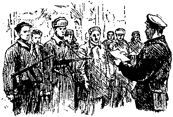 Как Женя ни пытался связывать проволокой ботинки, они развалились окончательно и с обеих сторон: с пятки и с носка. Конечно, если бы в них не играть в футбол, ботинки еще безусловно послужили бы, а так приходилось выбрасывать вон. Работать же в депо без ботинок, когда кругом металл и тяжелые детали, было вовсе несподручно. Оставалось одно: надеть выходные, праздничные. Женя так и решил. Он урвал утречком минуту и побежал домой переобуться. С первого дня воины все деповцы жили на казарменном положении, и Женя впервые пришел домой. Обрадованные мать, бабушка и сестра тотчас же принялись угощать его: поставили на стол молоко, приготовились жарить любимую Женей яичницу-глазунью. Как ни отговаривался Женя, что он сыт, что в деповской столовой теперь кормят даже лучше, чем до войны, что ему некогда засиживаться — дорога каждая секунда, — всё-таки пришлось подчиниться. Он переобулся, умылся и уже хотел сесть за стол, но это время на крыльце послышались шаги, и в квартиру постучались. Женя распахнул дверь. В комнату вошли двое милиционеров — мужчина и женщина. Мужчина был лет тридцати пяти, женщина — моложе. Бабушка, мать — Анна Ивановна, сестра — Катя и сам Женя смотрели с удивлением на непрошеных гостей: своих, оршанских, милиционеров они знали наперечет, а эти были совершенно незнакомые. — Здравствуйте, товарищи! — козырнул мужчина. — Будьте добры, укажите нам дорогу на Красное. Мы милиционеры, ушли из Минска, который занят фашистами. — Из Минска! — всплеснула руками Анна Ивановна. — А на чем же вы приехали? — спросил Женя. — Мы шли пешком, — ответил мужчина. А женщина только смотрела куда-то в сторону и как-то особенно сладко улыбалась. — Садитесь же, пожалуйста! Отдохните с дороги! Минск ведь не близкий свет! — засуетилась бабушка. Милиционеры стояли в нерешительности перед накрытым к завтраку столом. — Садитесь, покушайте с дороги молочка, — предложила Анна Ивановна. — Вот и яишенка готова, — несла бабушка на стоя сковороду с глазуньей. Милиционеры переглянулись и сняли фуражки. — Помойте руки с дороги. Вы же запылились! Мама покажи, где рукомойник! — обратился к матери Женя. Милиционеры пошли за Анной Ивановной в коридор, где был рукомойник. Когда они вышли, Женя шепнул Кате: — Беги в конвойную команду. Это шпионы. Катя взглянула на Женю и, ни слова не говоря, юркнула в спальню. Милиционеры, умыв руки, вернулись в комнату и сели за стол. Бабушка и Анна Ивановна наперебой угощали путников и расспрашивали их о Минске, о войне. Милиционеры расписывали ужасы бомбежек и пожара Минска, говорили, что не сегодня-завтра фашисты будут в Орше, что надо уходить. Женя сидел возле милиционера, яичницы не ел, только пил молоко. Он плохо слушал, что говорят «гости», и ждал, когда же, когда придут красноармейцы. И вот эта минута настала: дверь широко распахнулась и в комнату вошли четверо красноармейцев и лейтенант. Бабушка и Анна Ивановна испуганно вскочили. — Руки вверх! — сказал лейтенант, направляя на «милиционеров» наган. Те послушно подняли руки вверх. Их заставили выйти из-за стола, обыскали, — кроме наганов в кобурах, другого оружия у «милиционеров» не оказалось. Мужчина всё время ругался, доказывая, что это ошибка, что они милиционеры из Минска, и настаивал, чтобы тут же проверили их документы, но лейтенант не сдавался: — Ступайте, там разберемся! И обоих