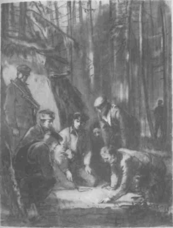 Заслонова больше всего беспокоило задание райкома ликвидировать громадный склад зерна в Будрине. Ларионов прислал к нему связного с просьбой ускорить операцию. Райком получил сведения, что оккупанты хотят еще до весенней распутицы вывезти к железной дороге из Будрина все две тысячи тонн зерна. Потому надо было торопиться. А тут, как назло, стали ясные лунные ночи. В весеннюю, темным-темную ночь, когда не видно в двух шагах, легко можно подкрасться к складу и бросить бутылку с зажигательной смесью. Пусть даже устроена вышка и на вышке торчит с пулеметом полицай. Каждый партизан вообще с ненавистью смотрел на луну. Она всегда была его врагом, а здесь еще более пришлась некстати. Командир отряда ходил сумрачный. Штаб придумывал разные варианты уничтожения склада, но не мог придумать ничего подходящего. Так прошло два дня. На третий ранним утром Заслонов умывался у своей землянки, когда к нему подошел адъютант — Женя Коренев. Его голубые глаза глядели по-мальчишески озорно. Женя был чем-то возбужден. Сзади за ним стоял молчаливый и обычно угрюмый Леня Вольский. Но и он сегодня казался более оживленным и веселым, чем всегда. Дядя Костя сухо ответил на приветствие друзей ждал, что последует дальше. — Товарищ начальник! — начал официально Женя. Так называли дядю Костю рабочие в глаза. — Разрешите мне и товарищу Вольскому рассказать наш план.. — Какой план? — удивленно повернул к Жене намыленное лицо Заслонов. — План уничтожения склада в Будрине, — выступил вперед Леня. Дядя Костя улыбнулся. — А-а, старые поджигатели! — вспомнил он, как друзья прекрасно подожгли фашистский гараж. — Что ж, давайте послушаем. И, вытираясь на ходу, он шагнул в землянку. Здесь были: комиссар Алексеев, начальник штаба, Норонович и дед Куприянович. — Товарищи, важная новость, — сказал Заслонов, входя в землянку. — Вот друзья пришли рассказать нам о своем плане поджога будринского склада… — Послушаем, — пододвинулся к столу Алексеев. Комиссар вставал рано и был уже одет и умыт. Начальник штаба натягивал сапог. — Я сейчас… Уже готов! — стукнул он последний раз в пол каблуком. Норонович сидел с краю стола, недоверчиво сощурив свои кофейного цвета глаза. Ждал рассказа. Непоседливый, хоть и хромой, дядя Куприянович топал на месте. Новость его заинтересовала. — Теперь я понимаю, почему они — кивнул Куприянович на друзей, — с вечера до самой зари шепчутся в землянке и не дают другим спать. Уж я на них и покрикивал, признаться: «Спите вы, полуночники!» Заслонов высунулся из землянки. — Горохов! — окликнул он партизана-окруженца, который пристроился на пеньке брить двух товарищей: — Скажи, чтоб ко мне никто не входил! Ну, рассказывайте, орлы! Женя подошел к столу, сбитому из досок, и на его сосновой столешнице стал рисовать карандашом план села Будрина: — Вот лес. Он подходит почти к гумнам крайних дворов. С краю села — склад. Бывшее Заготзерно или Заготсено. Проволочный забор на столбах. Вышка, где часовой с пулеметом. Она устроена со стороны поля. Рядом со складом, шагах в тридцати, пепелище сожженной хаты. Двор спалили. Заборы разобрали на дрова. Против пепелища — через улицу — большой дом. Бывшая семилетка, казарма полицаев. Женя на секунду остановился, собираясь с мыслями. — Это всё мы и без вас знаем, — беззлобно сощурился Норонович. — Так это еще не план, не план, а тольк