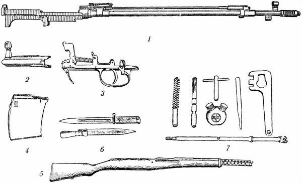 Рис. 2. Основные части самозарядной винтовки обр. 1940 г.: 1 — ствол в собранном виде; 2 — затвор; 3 — ударно-спусковой механизм; 4 — магазин; 5 — ложа со ствольной накладкой; 6 — штык; 7 — принадлежность