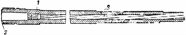 Рис. 89. Шомпол: 1 — рукоятка; 2 — шомпольный упор д) Шомпол (рис. 89) крепится на правой стороне в жолобе ложи. Он имеет рукоятку в виде трубки, в которой помещается шомпольный упор с пружиной. Рукоятка вращается на конце стержня шомпола для удобства пользования шомполом при чистке винтовки. е) Ствольная накладка и кожух отличаются в основном от ствольной накладки и кожуха винтовки обр. 1940 г. размерами (ствольная накладка длиннее, а кожух короче). ж) Крепление ствола с ложей, ствольной накладкой и кожухом осуществляется при помощи двух ложевых колец и болта нагеля. Ложевые кольца удерживаются защелками, расположенными в нижней части цевья, а болт нагеля вставляется в трубку с правой стороны и удерживается стрежнем шомпола. Ложевые кольца разрезные пружинные. з) Верхняя антабка расположена на заднем конце надульника; соответственно этому очертание задней части надульника отличается от очертания надульника винтовки обр. 1940 г. Нет защелки в нижнем выступе надульника, поскольку шомпол крепится в жолобе ложи. и) Штык более длинный и нет бортика защелки штыка. Поэтому при отбивании штыкового удара нужно стараться избегать нанесения ударов по защелке. В противном случае возможно соскакивание штыка с винтовки. 3. Порядок разборки винтовки обр. 1938 г. такой же, как и винтовки обр. 1940 г., за исключением отделения шомпола, ложи и крышки магазина.