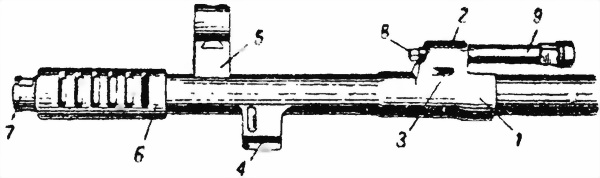 Рис. 3. Ствол со ствольной коробкой: 1 — надульник; 2 — газовый цилиндр со штоком, толкателем и пружиной; 3 — прицел; 4 — отражатель с остановом затвора; 5 — разобщитель автоматического спуска; 6 — втулка ствольной коробки; 7 — запор втулки с упором и пружиной; 8 — защелка скобы