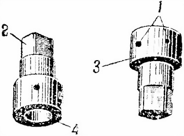 Рис. 6. Газовый регулятор: 1 — поперечные отверстия; 2 — головка; 3 — заплечико; 4 — продольный цилиндрический канал