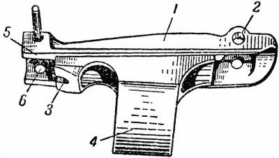 Рис. 31. Курок: 1 — цапфы; 2 — автоматический взвод; 3 — боевой взвод; 4 — продольный вырез; 5 — штифт; 6 — головка с гребнем