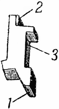 Рис. 20. Останов затвора: 1 — нижний выступ; 2 — верхний выступ; 3 — вырез 21. Останов затвора (рис. 20) служит для удержания затвора в заднем положении при израсходовании патронов из магазина. Останов имеет: нижний выступ для взаимодействия с подавателем; верхний выступ для удержания затвора и вырез для пружины, которая отжимает останов вниз.