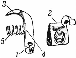 Рис. 33. Автоматический спуск: 1 — отверстие для оси; 2 — выступ; 3 — прилив; 4 — гнездо; 5 — пружина