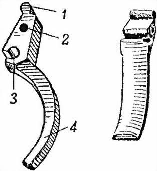 Рис. 36. Спусковой крючок: 1 — головка; 2 — отверстие для оси; 3 — вырез для пружины; 4 — хвост 37. Спусковой крючок (рис. 36) служит для приведения в действие частей ударно-спускового механизма. Он имеет: головку для соединения со спусковой тягой; отверстие для оси; вырез для прохода длинного пера пружины спусковой тяги и хвост для действия на него пальцем руки. 38. Пружина спусковой тяги (рис. 37) отводит передний конец спусковой тяги вверх, а хвост спускового крючка вперед. Она имеет: изогнутое короткое перо для действия на спусковую тягу; длинное перо для отвода хвоста спускового крючка вперед; выгнутый конец для штифта, удерживающего пружину от продольного смещения в спусковой скобе. 39. Предохранитель спускового механизма (рис. 38) служит для предохранения от случайного выстрела. Он имеет: стержень для соединения со спусковой скобой; флажок, ограничивающий смещение спускового крючка назад при отпущенном флажке предохранителя; выступ головки для ограничения проворота предохранителя; вырез для головки упора, который под действием пружины фиксирует положение флажка предохранителя.