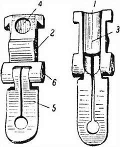 Рис. 34. Коромысло: 1 — цапфы; 2 — шептало; 3 — нижний вырез; 4 — овальное отверстие; 5 — гнездо; 6 — поперечный уступ 35. Коромысло (рис. 34) служит для удержания курка на боевом взводе. Оно имеет: цапфы для соединения со спусковой скобой; шептало для постановки курка на боевой взвод; нижний вырез для прохода конца спусковой тяги; овальное отверстие для прохода направляющего стержня боевой пружины; гнездо для упора конца боевой пружины и поперечный уступ для выступа спусковой тяги. 36. Спусковая тяга (рис. 35) служит для освобождения боевого взвода курка с шептала коромысла. Она имеет: передний плоский конец для прохода в вырез коромысла; стойку, на которую действует направляющий стержень боевой пружины и опускает спусковую тягу вниз; выступ для действия на уступ коромысла и загнутый конец для соединения со спусковым крючком.