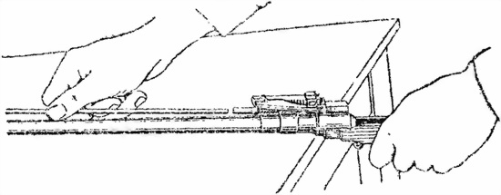 Рис. 67. Отделение ложи от ствола 6. Отделить газовый цилиндр, шток и толкатель стебля затвора: положить ствол прицелом вверх, удерживая левой рукой газовый цилиндр на патрубке; правой рукой подать шток доотказа назад, отвести его передний конец немного в сторону, а левой рукой снять газовый поршень с патрубка (рис. 68); подавая правой рукой шток вперед, вынуть его из гнезда толкателя затвора (рис. 69), затем вынуть вперед из отверстия ствольной коробки толкатель затвора с пружиной (если он не вышел оттуда вместе со штоком); снять пружину с толкателя затвора.