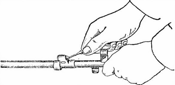 Рис. 71. Отделение регулятора 8. Отделить ударник от затвора: выколоткой вытолкнуть штифт ударника из отверстия остова затвора и вытащить ударник вместе с пружиной из гнезда остова затвора. 59. Порядок сборки винтовки 1. Установить регулятор и патрубок: положить ствол прицелом вверх, вставить в гнездо газовой каморы регулятор пятигранником вперед, установить грань регулятора с надлежащей цифрой кверху, так чтобы эта грань была горизонтальна, завинтить патрубок доотказа сначала рукой, а затем при помощи ключа, после чего еще раз проверить горизонтальность верхней грани регулятора. 2. Собрать газовый цилиндр, шток и толкатель стебля затвора: надеть пружину на толкатель, вставить задний конец штока в гнездо толкателя, правой рукой вставить шток с толкателем и с пружиной в отверстие ствольной коробки, подать шток доотказа назад, отвести его передний конец несколько в сторону левой рукой надеть газовый цилиндр на патрубок и вставить передний конец штока в гнездо цилиндра. 3. Присоединить к стволу ложу: удерживая ствол правой рукой за ствольную коробку, левой рукой завести передний конец кожуха в раструб надульника и ввести ствольную коробку в окно ложи; положить винтовку левой стороной на стол и, вставив с правой стороны болт нагеля, при помощи ключа завинтить его доотказа. 4. Надеть ствольную накладку: положить винтовку прицелом вверх, удерживая ее левой рукой за шейку приклада; правой рукой приподнимая передний конец ствольной накладки слегка кверху, завести задний конец ее за выступ колодки прицела и прижать ствольную накладку к стволу. 5. Надеть верхний кожух: правой рукой ввести загибы переднего конца кожуха в пазы нижнего кожуха и опустить задний конец кожуха на передний конец ствольной накладки. 6. Надеть ложевое кольцо: поставить винтовку вертикально, надеть на ложу кольцо антабкой влево и подать его вниз до заскакивания зуба защелки за передний срез кольца; предварительно утопить зуб защелки в вырез ложи. 7. Вставить шомпол: для этого нажать на защелку, ввести передний конец шомпола в отверстие выступа надульника и подать шомпол вниз настолько, чтобы зуб защелки оказался выше выступа на стержне шомпола, после чего освободить защелку. 8. Вставить ударно-спусковой механизм: повернуть винтовку прицелом вниз, предварительно проверив положение флажка запора втулки ствольной коробки, который должен быть повернут влево, ввести цапфы переднего конца спусковой скобы в вырезы ствольной коробки, нажать на задний конец спусковой скобы и энергичным толчком ладони правой руки подать спусковую скобу в вырез ложи (рис. 72); зуб защелки при этом должен заскочить в вырез скобы, а задняя стенка втулки ствольной коробки должна вплотную подойти к задней стенке ствольной коробки; повернуть винтовку прицелом вверх, опустить флажок вниз, поворачивая его слева направо.