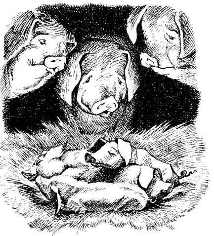 Свиньи не знали доподлинно, куда девались шпунтики или же покалеченные поросята, на которых нечаянно наступила или улеглась мать. Они знали только, что являлся служитель и уносил несчастного, поэтому они и выражались «забрать». Они ничего не ведали о существовании тяжелой деревянной дубинки, которую свинарь держал в сарае с кормом и с помощью которой жаловал милосердную смерть слабым и покалеченным.