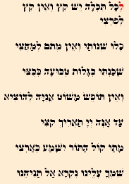Есть у всего конец, но нет конца у Зла. Несчастиям моим и ранам нет числа. Судьба меня в галут, в изгнанье занесла, И в грязь, и в тяжкий труд, как вьючного осла. Нет лодки, чтоб уплыть, и нет в руке весла, И Божьей Воли нет, чтоб наш народ спасла... Верни нас, Господи, в страну, что ночью снится, Где ветер ласковый и гулит голубица.мехуцим ульхуцим совелей маамас