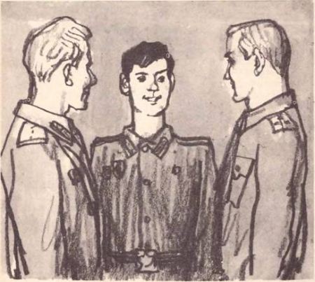 — Вольно, вольно, — сказал генерал, когда они подошли к стоявшим по стойке «смирно» старшему лейтенанту Кудрявцеву и рядовому Сорокину. — Продолжайте заниматься своим делом. — А у нас перерыв, — сказал старший лейтенант Кудрявцев. Он вдруг шагнул навстречу генералу и радостно воскликнул: — Товарищ полковник!.. Сорокин-старший изумлённо взглянул на замполита — неужели тот так растерялся от появления начальства, что уже не может отличить генеральские погоны от полковничьих! Он громко кашлянул, чтобы намекнуть замполиту на его оплошность. Но было уже поздно, — генерал, прищурившись, в упор разглядывал старшего лейтенанта Кудрявцева. — Сержант Кудрявцев! — неожиданно закричал он. — Вот так встреча! Сколько же лет мы с вами не виделись? — Восемь лет, товарищ полковник, виноват, товарищ генерал, — сказал старший лейтенант Кудрявцев. — Да, да, совершенно точно, восемь лет. Последний раз мы встречались с вами на учениях. Помните вы эти учения, Кудрявцев? — Помню, товарищ генерал. Ещё бы мне их не помнить! Я их, наверно, на всю жизнь запомнил. — Интересно, интересно, что же вы всё-таки запомнили? Расскажите-ка. Вот и солдаты ваши послушают, им тоже любопытно. Солдаты, и верно, уже успели окружить генерала и братьев Сорокиных и теперь с интересом смотрели на замполита, ждали, что он расскажет. — Значит, так. Дело было на больших учениях. Наша радиостанция обеспечивала связью командный пункт. Поставили мы свою машину в лесочке, замаскировали, как положено, всё нормально. Сидим в машине, работаем. А работы, надо сказать, было много. И обстановочка нелёгкая — помех в эфире полно. Шум, треск в наушниках, пока радиограмму примешь — намучаешься. А ещё накануне нас предупредили, что через наши головы артиллерия будет вести огонь настоящими боевыми снарядами — это, значит, для того, чтобы мы к боевой обстановке привыкали. Слышим, пушки бить начали. Не очень-то приятное ощущение. Но работаем. И вдруг… Вот честное слово, даже теперь, как вспомню, так мороз по коже продирает… Вдруг такой душераздирающий свист и вслед за ним сразу грохот! И ещё! И ещё! Ну прямо рядом с нашей машиной рвутся снаряды! «Конец, — думаю, — всё, конец!» Вижу, мой напарник, Коля Малинин, побелел, голову руками обхватил. А тут ещё рёв самолётов, бомбы свистят, еле я себя заставил на месте усидеть. И вдруг дверь машины распахивается и на пороге — полковник. Помните, товарищ генерал, какие тогда у нас лица были?.. — Помню, помню, Кудрявцев, всё помню… — Вы тогда ещё остановились на пороге и говорите: «Связь давайте! Связь, где связь?!» — Ну, положим, я в тот момент не говорил, наверно, я кричал, не так ли? — усмехаясь, сказал генерал. — Да всё равно слов-то не было слышно. Я по губам только и догадался, что вы говорили. «Какая тут связь, — думаю, — тут бы живым остаться! Не видит он, что ли, что творится! Не иначе, как наши артиллеристы ошиблись и в нас начали садить, вместо того, чтобы через наши головы стрелять». Жестами я что-то показываю, а сам, наверно, выгляжу не лучше моего напарника. Тогда полковник отстранил меня, сам наушники надел, сел к передатчику. Ну, тут меня заело! Он, выходит, не боится, а я боюсь. К тому же, без наушников да без дела уж и совсем невмочь слышать этот грохот да ждать, когда в тебя снаряд влепят. Короче говоря, всё-таки сел я к радиостанции, работать начал. Вижу, и Коля Малинин понемн