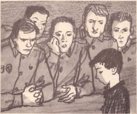 Он совсем разошёлся. Он рассказал про интернат, куда его определили по требованию сестры, той самой, которой он мешал играть на скрипке, и про коварную воспитательницу в интернате, по прозвищу Лиса Алиса, и про то, как он трое суток прятался под полкой в вагоне скорого поезда… — Да ты голодный, наверно? — спохватился вдруг всё тот же курносый солдат. — Есть хочешь? — Угу, — сказалСорокин. И тут же перед ним оказалась банка сгущённого молока, и кружка с кипятком, и огромная горбушка серого хлеба. — Рубай, рубай молоко, не стесняйся, — говорил сержант, подсовывая ему столовую ложку. Сорокин и на самом деле почувствовал, что проголодался. Он принялся за еду, а солдаты с удовольствием наблюдали, как он ест. — Ничего, не бойся теперь, мы тебя в обиду не дадим… — Может, ещё хлеба подбросить, а? — Ну-ка, Смирнов, принеси парню ещё кипятку!.. — Ребята! — сказал вдруг курносый. — А что, если… Оставить парня у нас… Сыном полка, а?.. — Так тебе и разрешили! Сейчас не военное время… — Ну и что, что не военное! Если попросим… А, ребята? — Он обнял Сорокина за плечи. — Ишь ты, худющий какой! Сразу видно — некормленый… Ничего, у нас на солдатских харчах быстро поправишься! Ну как, Воробьёв, пойдёшь к нам сыном полка? Ах, если бы он и правда был Валеркой Воробьёвым из Владивостока! Как хорошо ему было сейчас сидеть среди солдат и чувствовать себя в центре внимания! А может быть, можно сделать как-нибудь так, чтобы он был и сыном полка, и сыном своей мамы одновременно! — Сошьём тебе гимнастёрку, галифе, сапожки закажем, будешь, Воробьёв, щеголять — красота! — Сейчас начальник караула придёт, в баню тебя отправим, потом спать определим, а завтра все вместе — к командиру полка! — Да ты не горюй, Воробьёв, я вон тоже в детдоме рос, не хуже других вырос… — Я и не горюю… — сказал Сорокин. Он уже успел осмотреться в караульном помещении, и всё здесь нравилось ему: и пирамида с автоматами в коридоре, и топчаны, на которых, не раздеваясь, спали отдыхающие караульные, и какие-то, наверно, секретные, карты на стене, задёрнутые матерчатыми шторками… — Я всю жизнь мечтал стать сыном полка, — сказал Сорокин. — Я… Он не договорил. Внезапно с грохотом распахнулась тяжёлая дверь караульного помещения. Первым вошёл дежурный по части — капитан с красной повязкой на рукаве. Вторым вошёл лейтенант, тоже с красной повязкой — начальник караула. А за ними… Ложка выпала из рук Сорокина-младшего. На пороге он увидел своего брата. Рядовой Сорокин молча смотрел на Сорокина-младшего. — Так вот ты где! — наконец негромко сказал он. — А ну, вставай, живо! Сорокин-младший послушно поднялся из-за стола. Солдаты растерянно молчали и старались не смотреть на него. Конечно, кто он был теперь для них — самозванец, болтун, обманщик… Чего бы только он ни сделал, чего бы ни отдал, лишь бы они взглянули на него по-прежнему! Он хотел объяснить всё, сказать, что он не нарочно, сказать, что он… Он потянулся было к курносому солдату, но тот махнул рукой: — Ладно, иди, иди… Никто не обращал на него внимания. Брат подтолкнул его в спину: — Идём! И тогда Сорокин-младший заплакал.