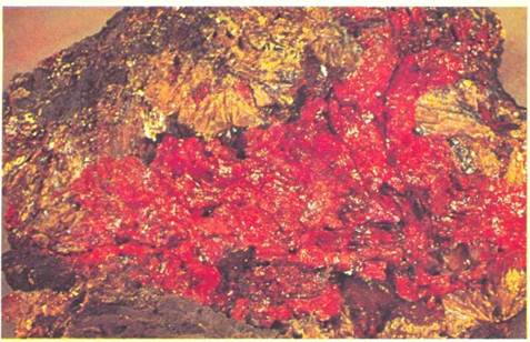 Несмотря на то, что корунды любых расцветок теперь выращиваются промышленным способом, природный минерал не перестал быть драгоценным камнем, а образцы цветных корундов по-прежнему занимают почетные места в коллекциях и музеях. На фотографии — рубины в слюдистом сланце.
