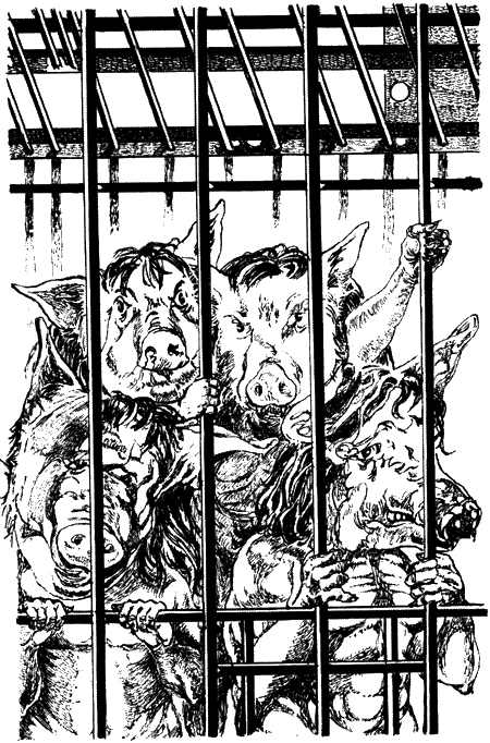 Огромная свинья с человеческими ногами и руками и с человеческими ушами протиснула пятачок сквозь прутья клетки. Рядом с ней сидел поросенок с длинным конским хвостом.