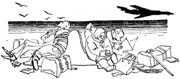 Дежурный Хоринской авиаплощадки снова вышел на крыльцо и, сдвинув фуражку на затылок, озабоченно посмотрел в небо. Неровный гул, доносившийся из-за облаков, давно уже беспокоил его. Было такое ощущение, что вот уже в течение десяти минут над взлетным полем кружится, не решаясь сесть, какой-то самолет. Дежурный обеспокоенно почесал бровь. На этот час по расписанию никаких самолетов не ожидалось. Разве что случайно залетел «Антошка» из службы противопожарной охраны. Но почему он тогда не выходит на связь? Впрочем, судя по звуку, это была двухмоторная машина класса устаревшего «Ил-14», а может быть, и тяжелее. Почему он кружит? Не находит ориентиров? Но на поле все в порядке. Дежурный придирчиво оглядел свое хозяйство и снова почесал бровь. Честно говоря, хозяйство это было невелико. Весь аэродром состоял из грунтовой взлетно-посадочной полосы да домика, в котором размещались диспетчерская с простенькой рацией на столе, крошечный зал ожидания, касса и квартира директора местного леспромхоза. Типичная площадка для обслуживания пассажиров местных авиалиний. И вывеска с красиво выполненной надписью «Аэропорт Хоринцы», прибитая над дверью, мало что прибавляла к этому огорчительному для дежурного факту. Но за много лет дежурный постепенно свыкся с жизнью в далеком таежном краю, сроднился с местным населением и перестал терзать начальство рапортами с просьбой перевести в более оживленный аэропорт. Дежурный вернулся к себе и, включив радиостанцию, надел наушники. Эфир молчал. Сквозь шорох и треск атмосферных разрядов, еле слышные, пробивались лишь сигналы радиомаяка. Трогая пальцем бровь, дежурный задумчиво крутил верньер настройки. Но вдруг нарастающий рев моторов заставил его сбросить наушники и кинуться к окну. На площадку, заходя против ветра, садился самолет. Мгновение — и с выпущенными шасси он стремительно покатился по полосе, поднимая за собой волны пыли. Только теперь, когда он оказался достаточно близко, дежурный сумел разглядеть его. Это был до странного неопрятный внешне двухмоторный моноплан без каких бы то ни было опознавательных знаков на борту, кроме небрежно выведенного на хвосте номера. Катился он, непривычно высоко задрав переднюю часть фюзеляжа, напоминая снятые давно с производства самолеты «Ли-2», но контуром своим и размерами несколько отличаясь от них. Докатившись до конца площадки, незнакомец развернулся и замер, как вкопанный. И сразу натужный шум моторов утих: пилоты сбросили обороты. Но двигатели работали по-прежнему, винты продолжали рубить воздух. Дежурный надел фуражку и, на всякий случай придав лицу казенное выражение, вышел на крыльцо. Еще издали он заметил, что из самолета никто не выходит, но лишь приблизившись, понял почему. Просто у самолета не было привычной дверцы на борту. У дежурного перехватило дыхание. Стараясь не обнаруживать своего изумления, он осторожно обошел гостя и оказался с хвостовой его стороны. Ко и здесь ощущение необычности происходящего не исчезло. Подняв глаза, дежурный увидел силуэт человека под прозрачным фонарем, внимательно наблюдавшего за ним. Дежурного прошиб пот. Все было ясно: в самолете чужие. Да и сама машина, столь необычная по виду, вероятно, тоже издалека. Тут что-то было не так. Но что именно, дежурный не успел сообразить. На дамбе, отделявшей поселок от озера, пок