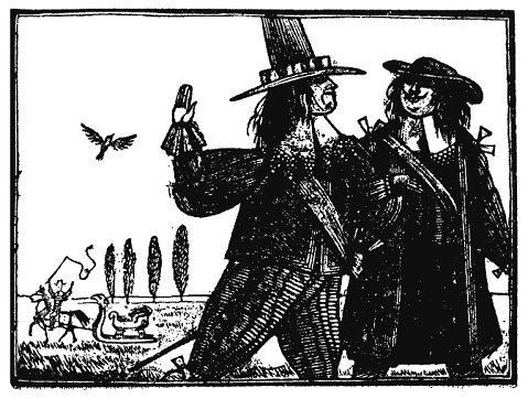 Кукушка прокуковала в первый раз в этом году, когда я простился с госпожой моей матушкой, обнял ее, трижды поцеловал на прощанье в каждую щеку и направился затем к городским воротам. И каким, будь я проклят, большим показался мне мир за ними! Я не знал, черт меня побери, куда мне податься – к закату ли солнца или на запад…[14] Наверно, раз десять тянуло меня вернуться и остаться у госпожи моей матушки, если б только я не дал страшную клятву возвратиться к ней не раньше, чем стану молодцом. Но, в конце концов, и это меня не остановило бы – потому что ведь и прежде случалось мне давать клятвы и не сдерживать их, и я непременно вернулся бы к госпоже моей матушке, если бы вдруг какой-то граф не подъехал ко мне напрямик через поле в санях с бубенчиками и не спросил меня, о чем я задумался. Я ответил, что намерен поглядеть на белый свет, а он мне кажется таким большим, что и не знаю, куда же мне направиться. На это граф сказал: «Мосье, вижу по вашим глазам, что вы человек порядочный и, если вы хотите поглядеть на белый свет, то садитесь в мои сани, так как я разъезжаю по свету с той же целью – хочу посмотреть, что в нем делается». Едва граф закончил, я мигом вскочил в его сани, засунул правую руку за пояс штанов спереди, а левую – в правый карман, чтобы не замерзнуть, ибо ветер был очень холодный, а вода в ту ночь покрылась льдом, толщиной в добрый локоть. Хорошо еще, что ветер дул нам в спину и не так сильно пробирал меня, потому что господин граф, сидевший сзади и правивший санями, тоже немного задерживал его; и так мы ехали по белу свету все дальше на юг. По пути мы рассказывали друг другу о своем происхождении. Господин граф начал первым и сообщил мне о своем графском званье и о том, что он происходит из очень древнего рода, насчитывающего тридцать два предка; он рассказал также, в какой деревне похоронена его бабушка, но я теперь это уже позабыл. Затем он начал болтать о том, как еще мальчишкой, в шестнадцать лет, он больше всего любил расставлять силки для птиц и как-то поймал в один силок зараз тридцать одну синицу, которых он велел зажарить в масле и съел, и они пришлись ему по вкусу. После того, как он поведал мне всю свою жизнь с начала до конца и я начал выкладывать ему историю о своем необычайном рождении и о крысе, изгрызшей совсем новое шелковое платье госпожи моей матушки, и о том, как она, прошмыгнув между ног моей сестры, неожиданно скрылась в щели, хотя и должна была быть прибита. Рассказал я также и о своем духовом ружье, из которого так метко стрелял. Когда я ему все это рассказал, господин граф – будь я проклят! – разинул рот и заметил, что из меня еще выйдет порядочный человек. Вскоре после беседы мы подъехали к харчевне, расположенной у дороги, прямо в чистом поле. Здесь мы сделали остановку, чтобы немного согреться. Едва мы, вошли в комнату, господин граф приказал хозяину харчевни наполнить водкой большую стопу, вмещающую в этих краях от 18 до 20 мер.[15] и предложил мне выпить с ним на брудершафт. Я и не представлял себе, что господин граф одним разом выдует такую стопу. Однако, черт меня побери, он все-таки выдул ее одним духом, не утерев бороды, и даже хозяин страшно удивился этому. Затем он приказал вновь наполнить стопу и обратился ко мне: «Ну-с, allons,[16] брат Шельмуфский! Сукин сын тот, кто не выпьет и за мое здоровье!» Сто тысяч чертей! Меня заело, что господин г