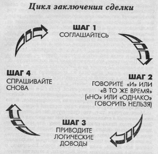 Поняв этот цикл заключения сделок и начав использовать его, я стала с удовольствием ждать работы, так как могла теперь показать клиентам, что не собираюсь доказывать им свою правоту или давить на психику. Действительно, этот цикл работает в большинстве случаев, когда нам приходится заключать сделку или договариваться о чем-либо, и очень может быть, что вы использовали этот цикл всю жизнь, даже не подозревая об этом.