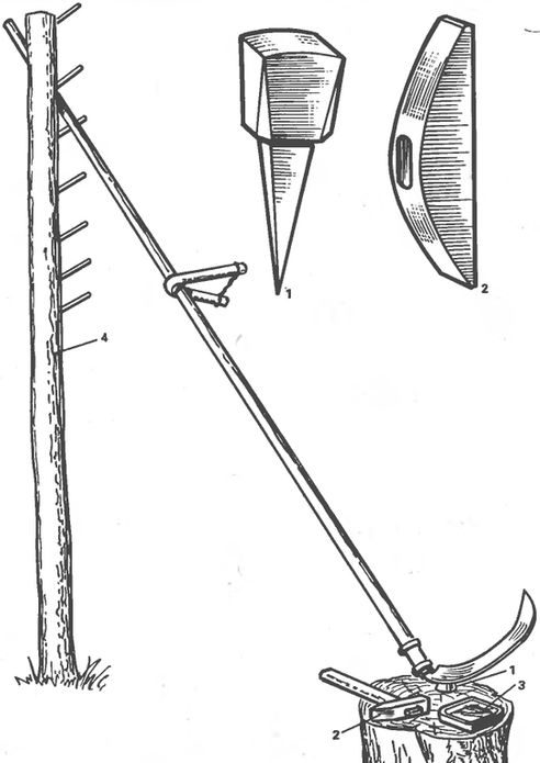 Рис. 12. Отбивка косы с помощью KC-1: 1 – опора (чурбан); 2 – нож косы; 3 – косоотбой; 4 – молоток