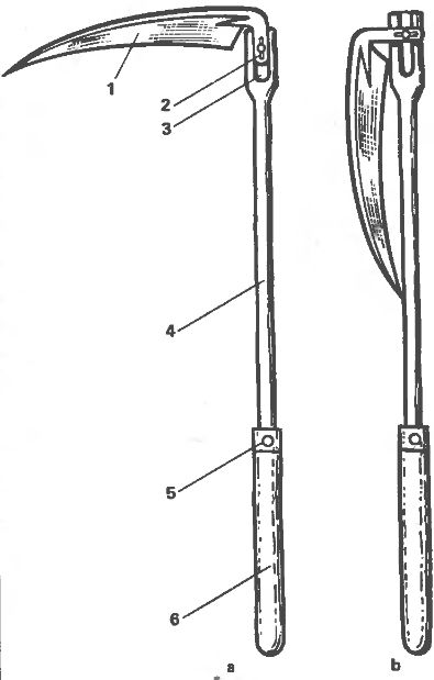 Рис. 23. Коса-серпан: a – рабочее положение; b – транспортное положение; 1 – нож косы; 2 – гайка-барашек; 3 – паз удлинителя; 4 – удлинитель; 5 – колпачок; 6 – черенок