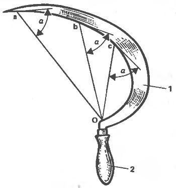 Серп предназначается для уборки (жатвы) зерновых культур. В наше время он используется на небольших опытных делянках, а также для уборки полеглых хлебов и риса. Серп состоит из изогнутого ножа с рукояткой (рис. 24). Форма режущей части ножа, а значит, и серпа определяется необходимостью обеспечения одинакового усилия в любой точке лезвия, возникающего при резании. В свою очередь, постоянство усилий в любой точке режущей кромки обеспечивается постоянством угла а в любой точке лезвия ножа (угол а – угол между прямой, проведенной из точки О, расположенной на оси симметрии рукоятки, в какую-либо точку лезвия ножа, и касательной в этой точке к кривой лезвия). Многолетняя практика использования серпов показала, чтоугол а=51° является оптимальным. На режущей кромке полотна (рис. 25) делается насечка глубиной 0,4 мм, в результате чего лезвие ножа состоит как бы из зубцов. Насечка выполняется или перпендикулярно к кромке лезвия (тип 1), или же под острым углом к ней (тип 2). Наибольшее распространение получили серпы с насечкой типа 2.