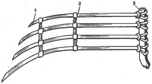 Рис. 26. Коса с легкими грабельками: 1 – зуб; 2 – сыромятный ремень; 3 – квадратный брус; 4 – кольцо; 5 – бечевка