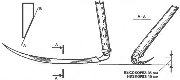 Подготовка косы к работе включает в себя заточку полотна, посадку ножа косы на косовище и отбивку лезвия. Если нож новый, то его сначала з а -тачиваютс нижней стороны по всей длине полотна на ширину 15-20 мм на мелкозернистом абразивном круге. При заточке нужно обязательно охлаждать нож водой, что предотвращает перегрев полотна. Для этого нижняя часть наждачного камня должна быть погружена в воду на 20-50 мм. Частота вращения круга не должна превышать 100 оборотов в минуту. Нож затачивают до появления тонкого заусенца на лезвии, который затем снимают абразивным бруском. Иногда нож затачивают на половину первоначальной толщины лезвия, а затем отбивают косоотбоями. Такая заточка полотна облегчает последующую отбивку косы. Затачивают нож, естественно, до его насадки на косовище. Перед насадкой ножа косовище ставят в вертикальное положение (заостренным концом вверх) и на уровне пупка косца на косовище делают метку (здесь будет крепиться ручка). Затем нижний конец косовища стесывают так, чтобы подъем лезвия полотна в разрезе А-А (рис. 7) составлял 10-20 мм для косьбы на ровном лугу и 25-35 мм – для местности с кочками, ухабами, оврагами. На стесанной плоскости делают аккуратное углубление для ши-пика пятки. Перед тем как сделать углубление, нож косы прикладывают пяткой к стесанной плоскости косовища и добиваются, чтобы расстояние от места присоединения ручки к косовищу до обушка пятки равнялось расстоянию от того же места на косовище до носика ножа. При этом пятка ножа должна располагаться примерно посередине стесанной плоскости косовища.