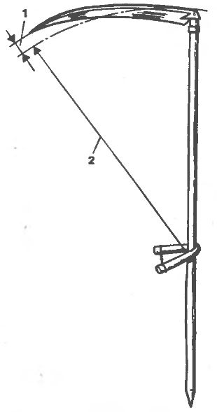 После этого отмечают карандашом положение шипика на плоскости косовища и делают углубление для шипика так, чтобы шипик входил в углубление с небольшим натягом. Для проверки подъема лезвия предварительно (не накрепко) насаженную косу устанавливают ножом на ровную гладкую поверхность, как при косьбе. Между лезвием и полом должен быть необходимый зазор (см. рис. 7). Затем с помощью шнура устанавливают захват косы (рис. 8), то есть отклонение носика ножа косы в наружную сторону от дуги, проведенной из точки присоединения ручки к косовищу через обушок пятки ножа. Для этого пальцем одной руки прижимают шнур к тому месту косовища, где будет присоединена ручка, а другой рукой подводят натянутый шнур к обушку пятки ножа, фиксируют эту длину шнура и, не сбивая отметки на шнуре, подводят его к острию носика косы. Если отмеченное расстояние на шнуре соответствует расстоянию от места установки ручки до носика, то захват равен нулю. В случае, когда расстояние до носика больше,- захват называют положительным, когда меньше – отрицательным. Обычно косцы устанавливают положительный захват в пределах 0-20 мм в зависимости от твердости и густоты травы, а также своей физической силы. Некоторые же косцы предпочитают даже отрицательный захват до 10 мм.