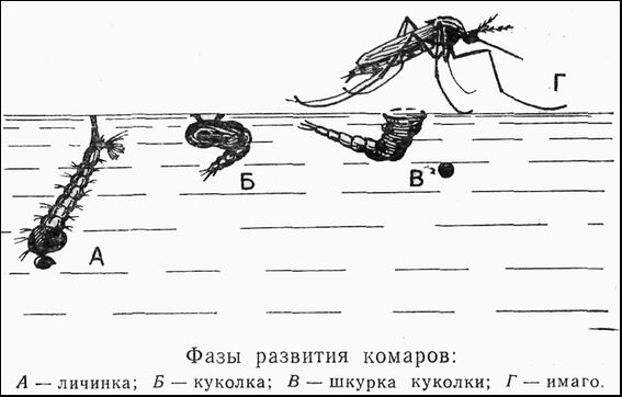 Все знают, что комары причиняют людям и животным много страданий. Но не каждому известно, что такую назойливость проявляют только самки, причем лишь после спаривания. Самцы же довольствуются соками различных растений. Вечером можно наблюдать роение (брачный танец) комаров. Тысячи самцов образуют в воздухе своеобразное "поющее" облако. Самки одна за другой влетают в рой и тут же покидают его, увлекая одного из самцов. После спаривания у них пробуждается инстинкт кровососания. Насыщение самок кровью обязательно для развития и последующей откладки яиц. Но при этом самки представляют опасность для человека и животных в эпидемиологическом отношении. Напившись крови в первый раз на больном человеке или животном, при повторном кровососании они со слюной вводят возбудитель инфекционного заболевания в кровь здорового человека. Самки могут приступать к яйцекладке и в том случае, если они приняли неполную порцию крови. Способы откладки яиц у разных видов комаров различны. Самки комаров Anopheles (Анофелес) и Culex pipiens (Кулекс пипиенс) откладывают зрелые яйца на поверхности воды. Всякая самая мелкая лужица, ямка, канава или впадина, наполненные водой, могут служить местом откладки яиц. С. pipiens охотно откладывает яйца также в пожарные бочки, тазы, корыта и другие емкости, наполненные водой. Комары родов Aedes (Аэдес) и Culiseta (Кулизета) откладывают яйца также на влажное дно подсыхающих водоемов, периодически заполняющихся водой. Кровососущие комары проходят четыре фазы развития: яйца, личинки, куколки и взрослого (окрыленного) насекомого.