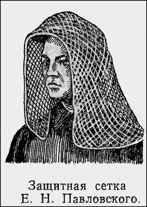 В порядке предпочтения методы и средства индивидуальной защиты человека от кровососущих насекомых можно расположить следующим образом: 1) механические средства и методы защиты; 2) одежда, ткани, защитные сетки и другие средства, пропитанные отпугивающими веществами; 3) непосредственное нанесение репеллентов на кожу. Лучший способ механической защиты от гнуса – ношение специального защитного костюма. В комплект защитной одежды входят: рубашка нательная из утолщенного полотна (толщина перемычки 3,6-3,7 мм, размер ячеек 7x7 мм), рубашка верхняя из мелкоячеистого полотна (размер ячеек 0,5x0,5 мм, толщина 0,5 мм). Назначение нательной рубашки – создание пространства между телом человека и верхней одеждой, равного длине хоботка комаров (наиболее массовых кровососов). Верхняя рубашка препятствует проникновению мелких насекомых (мошек). Обе рубашки надежно защищают от укусов гнуса и вместе с тем благодаря сетчатости обеспечивают достаточную вентиляцию тела, в них не жарко работать. Голову, шею и лицо защищают пропитанной репеллентом накидкой, спускающейся на плечи и оставляющей лицо открытым. Она изготовляется из хлопчатобумажного тюля или тонкого трикотажного полотна. Длина накидки – до 30 см, ширина 80-100 см. Ее укрепляют на головном уборе при помощи бельевой резинки, продетой по верхнему краю накидки. Спереди и по краям накидка состоит из двойного слоя ткани (ширина полосы 10 см). Для пропитывания накидки требуется 10-15 г репеллента. Защитные свойства при использовании, например, ДЭТА сохраняются 3-4 недели. При хранении в полиэтиленовом пакете срок действия обработанной накидки увеличивается. Применение накидок из тюля более эффективно, чем сеток из хлопчатобумажной ткани. По образцу тюлевых можно изготовлять накидки из дешевых тканей (не сетчатых) – миткаля, ситца, кисеи. На накидку расходуется 0,4-0,5 кв. м ткани. Вес накидки из миткаля или кисеи -35-40 г, из ситца -45-50 г. Пропитывать их рекомендуется растворами ДЭТА в ацетоне, из расчета 15 г репеллента на накидку. Накидки из названных тканей хорошо стираются. Они удобны в применении и доступны для населения. Не потеряли своего значения и накомарники, надежно защищающие от нападения кровососов. В помещении, палатках из механических средств защиты можно применять полог. Его легко изготовить самому. Над кроватью, раскладушкой, диваном, спальным мешком на высоте 1 м протягивают и закрепляют с двух сторон шпагат (шнур, бинт и т. п.), на который навешивают кусок марли таким образом, чтобы это нехитрое сооружение получилось в виде крыши с крутыми скатами. Края марли подворачивают под матрац. В торцовые части вшивают куски марли. При достаточном количестве марли можно обойтись и без вшивания торцовых сторон полога (на один полог требуется 14 м марли). При ограниченном количестве этой ткани возможно использование двух сшитых вручную простыней, из которых изготовляется полог по описанной выше методике. При этом в торцовые стороны необходимо обязательно вшить куски марли соответствующего размера. Одним из основных способов применения репеллентов является пропитывание ими одежды, тканей, защитных сеток и других средств. Марлевые и кисейные косынки, чулки, носки, хлопчатобумажные комбинезоны, марлевые капюшоны пропитывают растворами, эмульсиями и чистыми репеллентами. Расход чистого препарата в средне