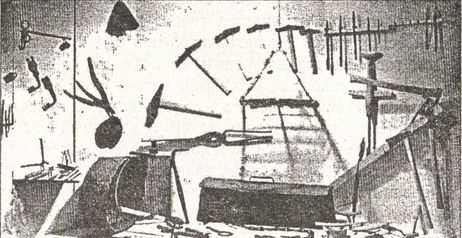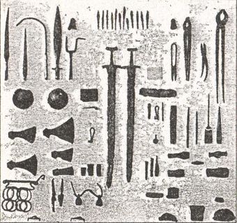 Илл. II а. Орудия, обнаруженные в захоронении норвежского кузнеца, относящемся, вероятно, к X веку, в Бюглане, Квитсейд, Телемарк. См. UOA (1945–1948, pp. 170–192. (Universitets Oldsaksamling, Oslo)